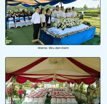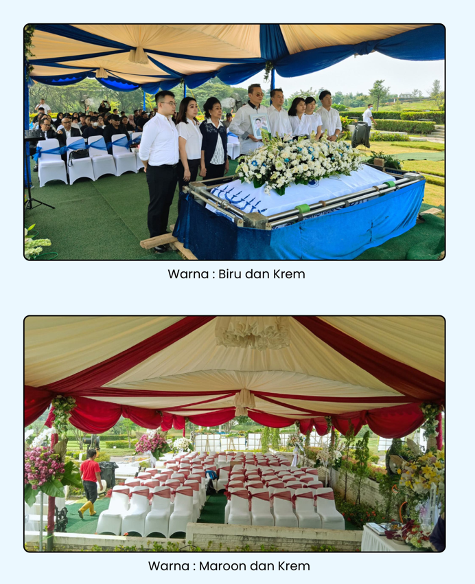 Merupakan Jasa Layanan pemakaman di San Diego Hills yang lebih eksklusif, yaitu dengan memakai tenda Dekor sudah termasuk kursi covered dan tanaman hias artificial sehingga suasana lebih rapi dan untuk kapasitas kursi yang lebih banyak.