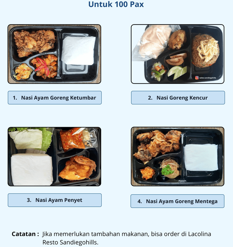 100 lunch box ( pilihan menu : nasi ayam goreng ketumbar , nasi ayam goreng mentega , nasi ayam goreng penyet atau nasi goreng kencur ).
