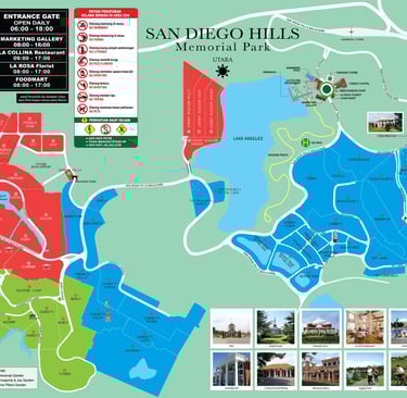Area Pemakaman yang secara umum mengikuti kontur alami dari kawasan San Diego Hills yang berkontur dan berbukit yang ditata dengan rapi dan berkonsep sehingga menjadi kawasan terbuka yang asri.